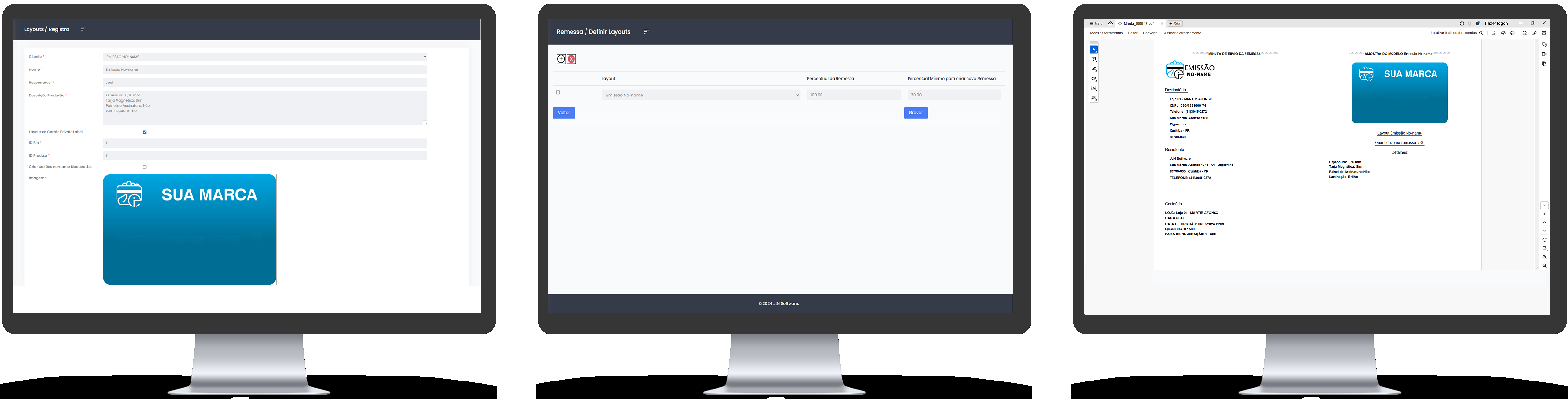 A solução funciona através de uma interface web segura, hospedada no servidor da JLN Software com certificação PCI. Para gestionamento dos cartões no-name, é utilizada uma integração via API com a Processadora e um canal seguro SFTP/FTPS com a Gráfica que realiza a produção dos cartões.